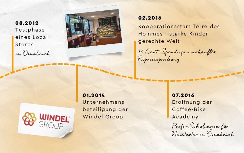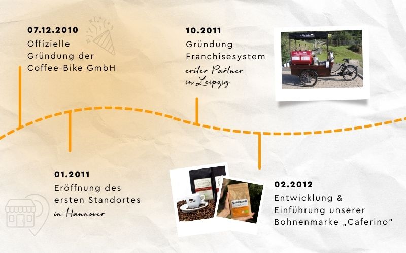 Zurück in Osnabrück wurde die Coffee-Bike GmbH gegründet und der erste Prototyp in der heimischen Garage entwickelt. An den Wochenenden folgten erste Verkaufstests in und um Osnabrück, während unter der Woche das Konzept und die Technik kontinuierlich weiter optimiert wurden.