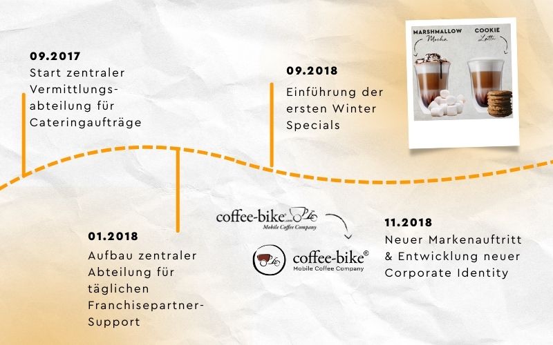 Bereits ein Jahr nach unserer Gründung nahm das Franchisekonzept konkrete Formen an. Aus anfangs zwei Franchisepartnern ist im Laufe der Zeit ein Netzwerk von mehreren hundert Coffee-Bikern entstanden. Parallel dazu entwickelte sich auch unser internes Team weiter: Aus dem Coffee-Bike Gründer Team wurde ein Unternehmen mit spezialisierten Fachabteilungen und einer eigenen Werkstatt.