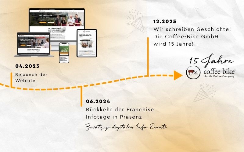 Von der ersten Idee bis zum erfolgreichen Franchisesystem. Wir haben unser Unternehmen und das Coffee-Bike selbst in den letzten 15 Jahren stetig weiterentwickelt. Was als Urlaubsidee begann, steht heute für ein starkes Partnernetzwerk, ein innovatives Produkt und fundierte Markterfahrung. Wir werfen einen Blick auf die Anfänge, die wichtigsten Meilensteine und die Lektionen, die uns auf unserem Weg geprägt haben.