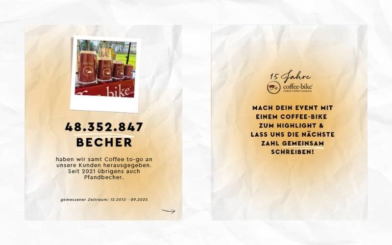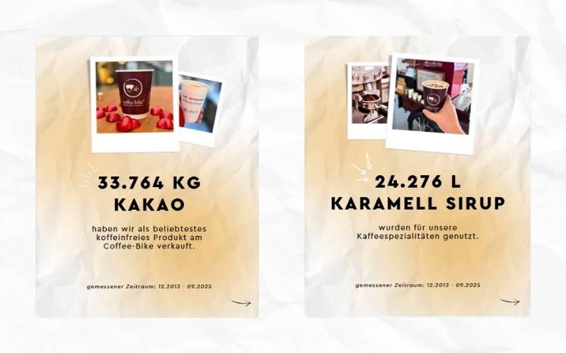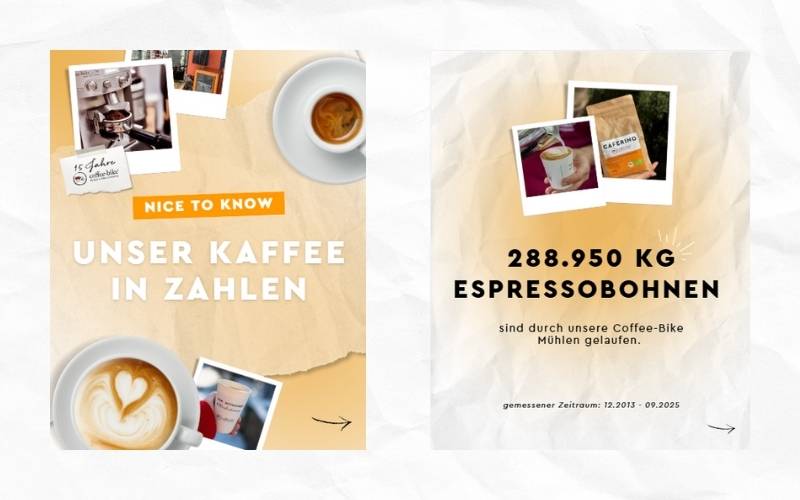 Schon seit Anfang September feiern wir auf Social Media mit euch: Spannende Rückblicke, witzige Funfacts und überraschende Zahlen aus 15 Jahren Coffee-Bike sorgen für unterhaltsame Einblicke.